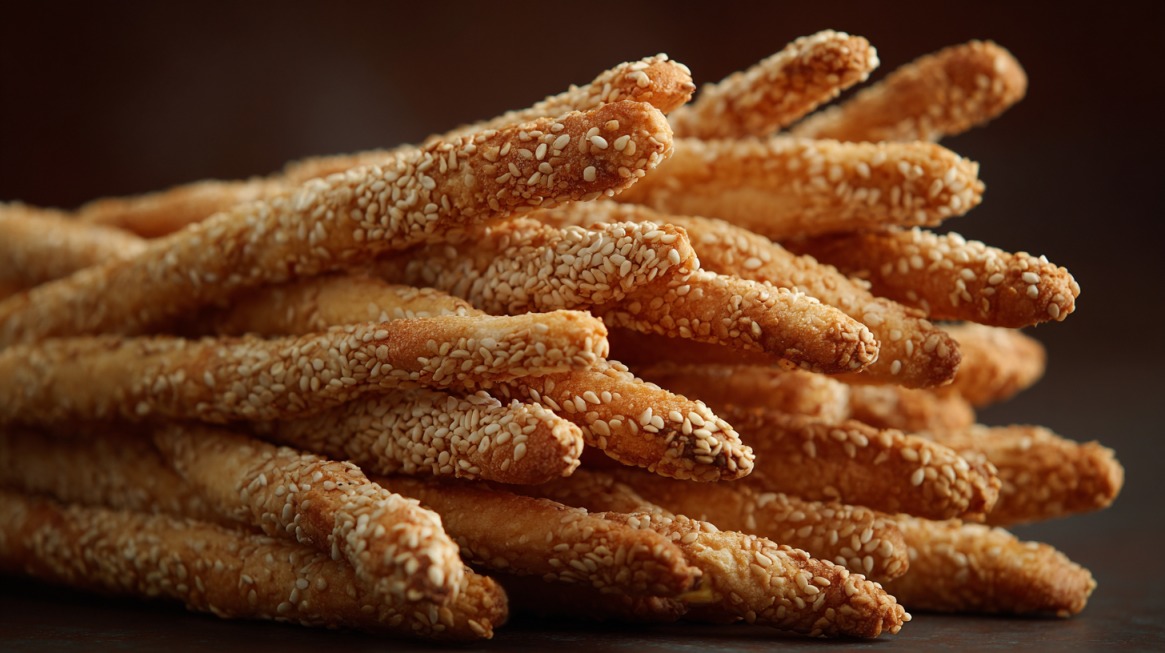 Sesame sticks are crunchy, savory snacks made mainly with sesame seeds and wheat flour.