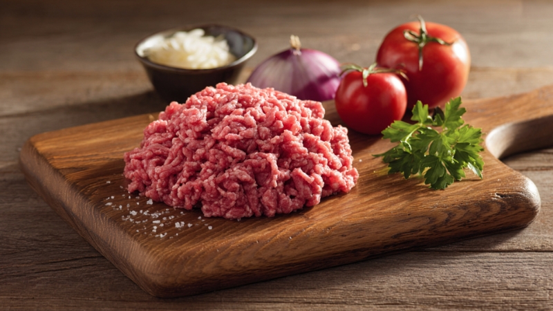 Separate raw ground beef from other foods to prevent cross-contamination. Store it on the bottom refrigerator shelf so juices cannot drip onto other products. Use separate cutting boards, utensils, and preparation surfaces for raw meat.